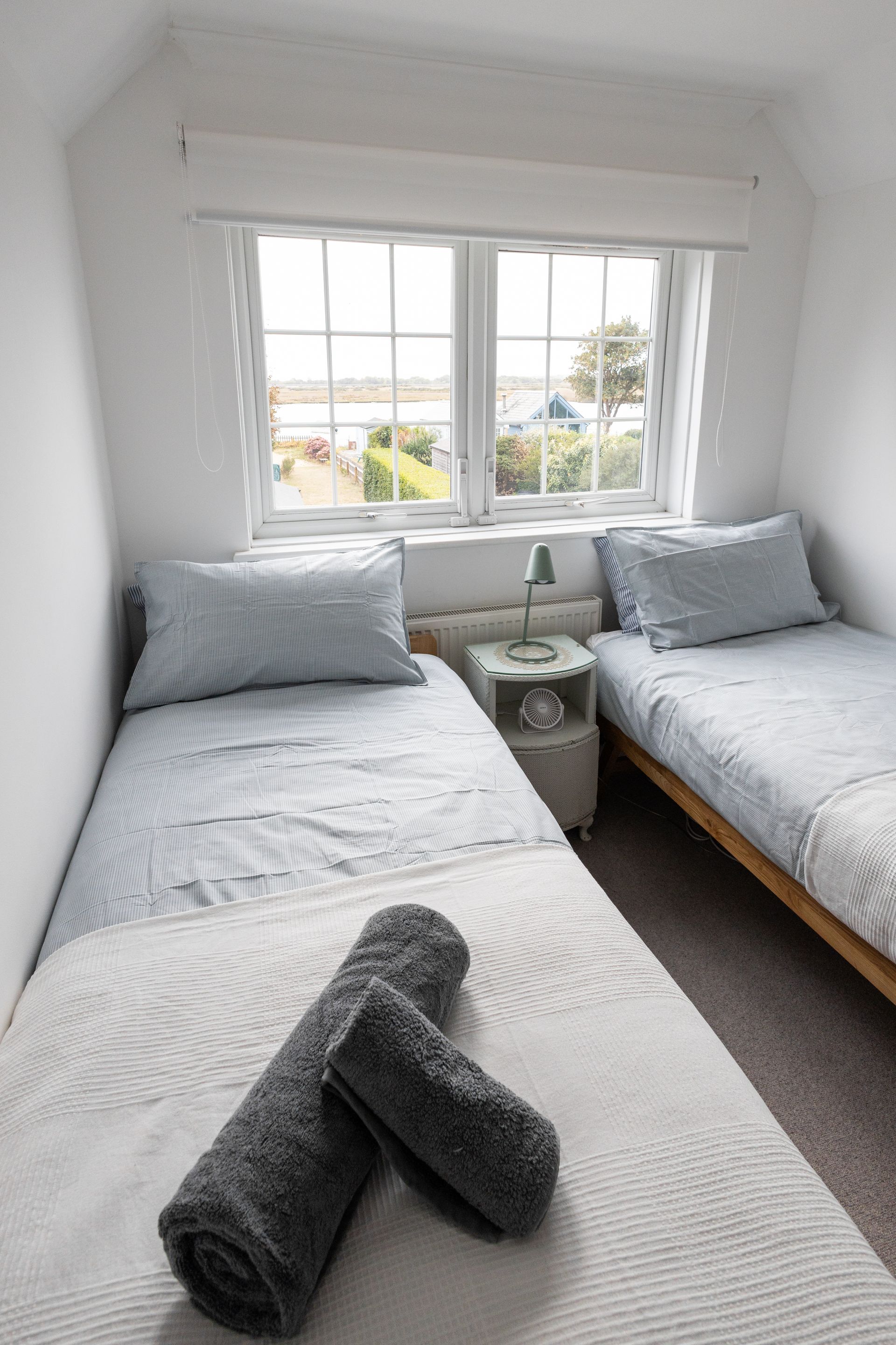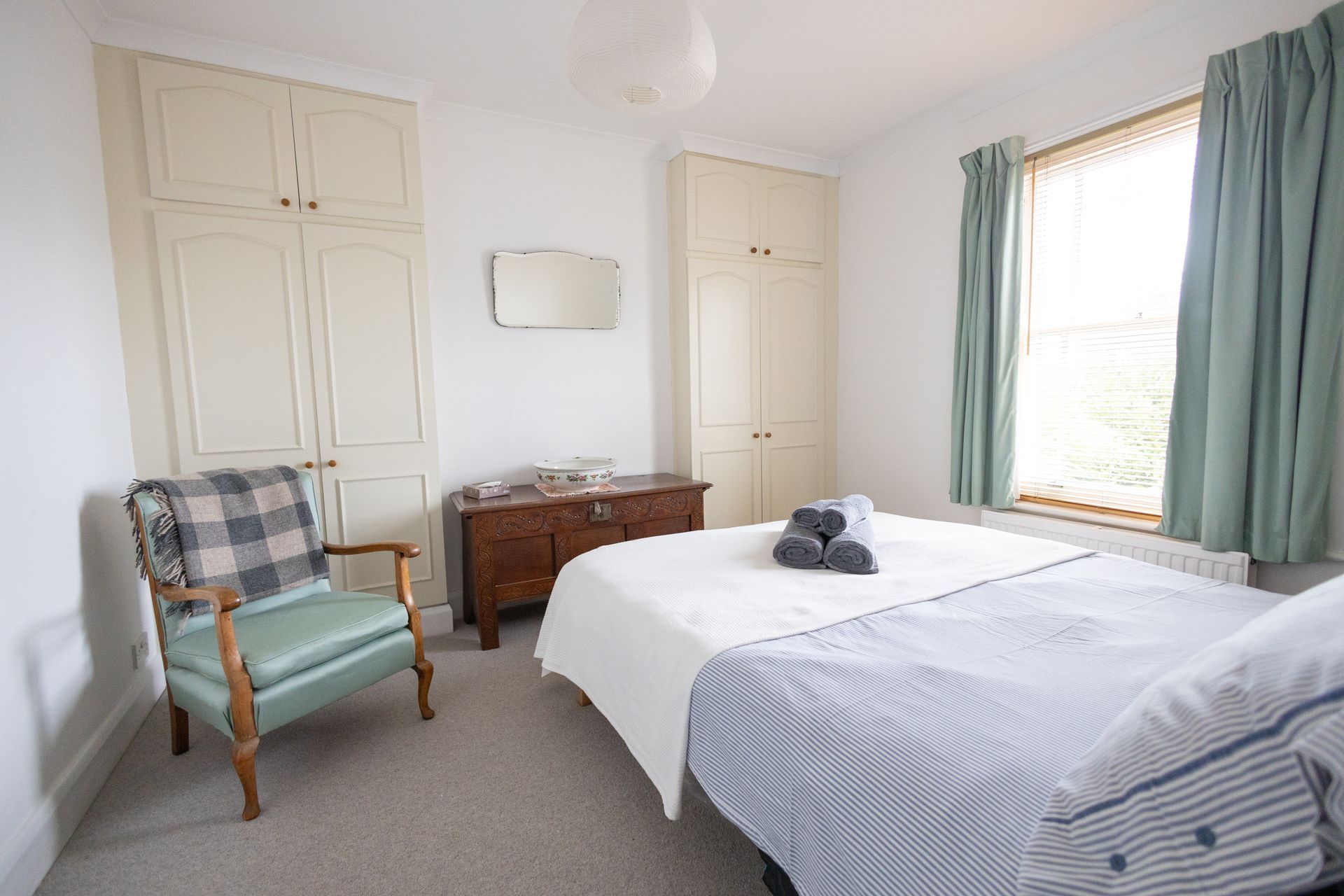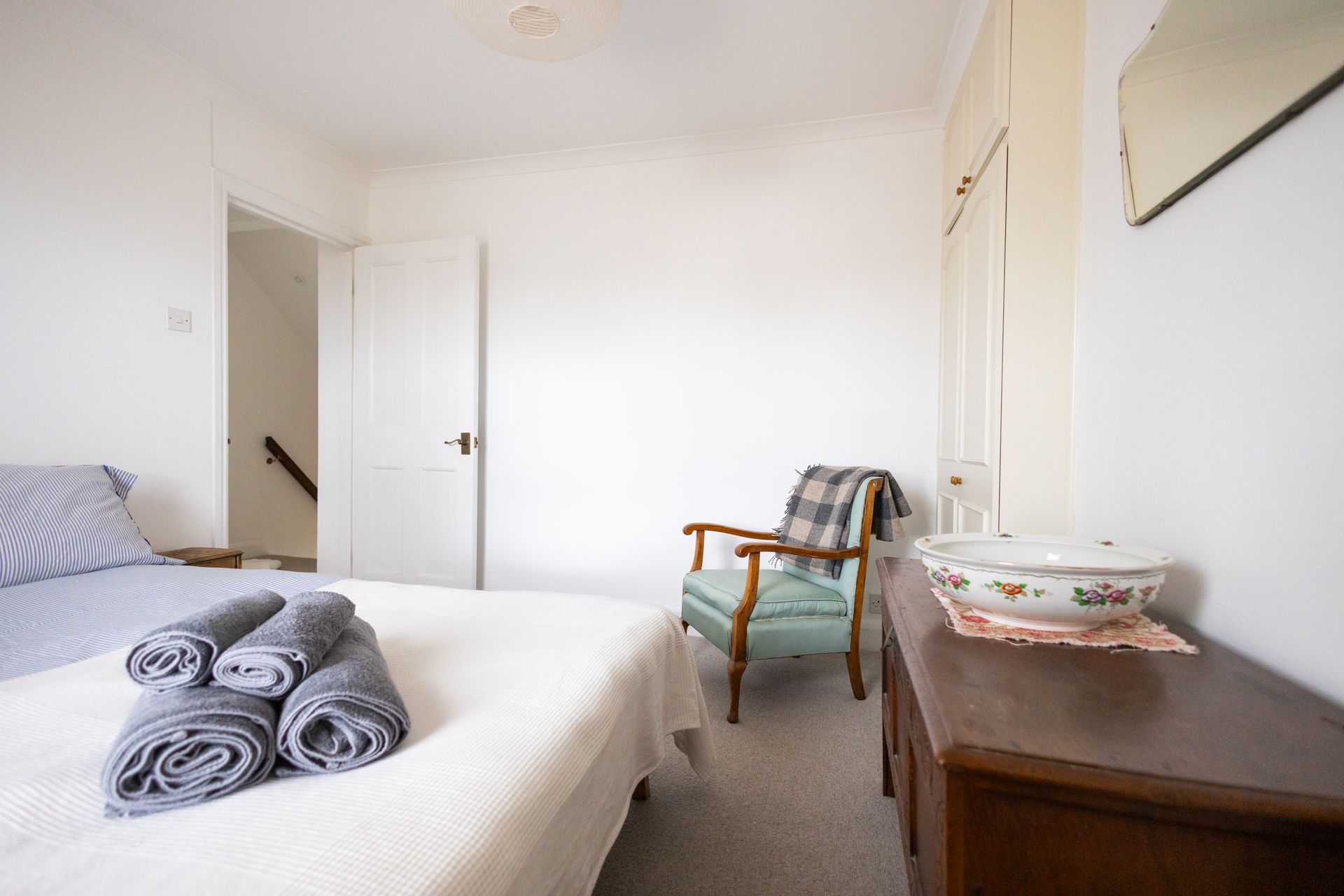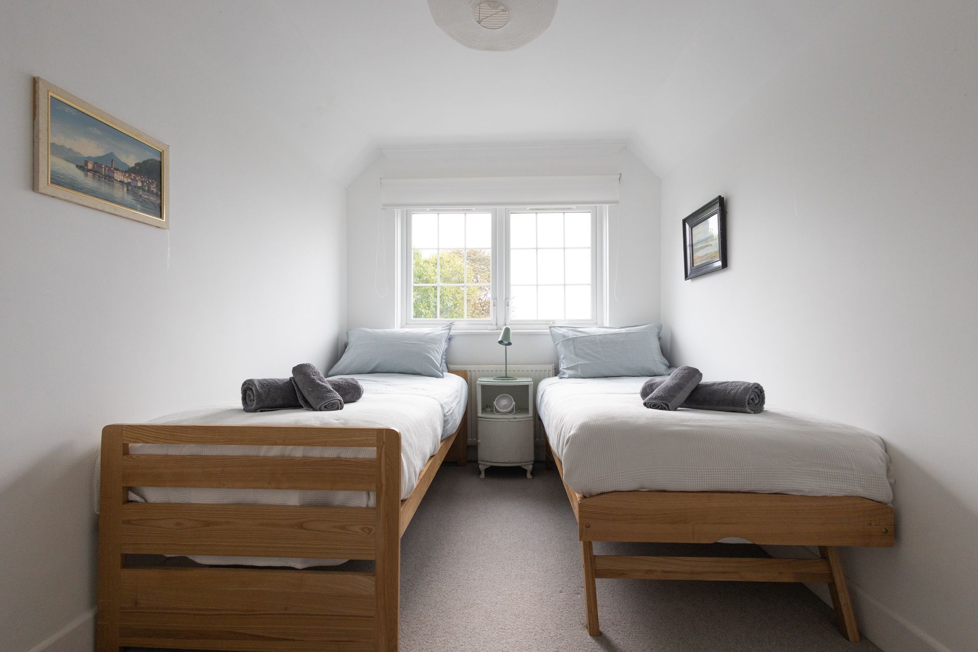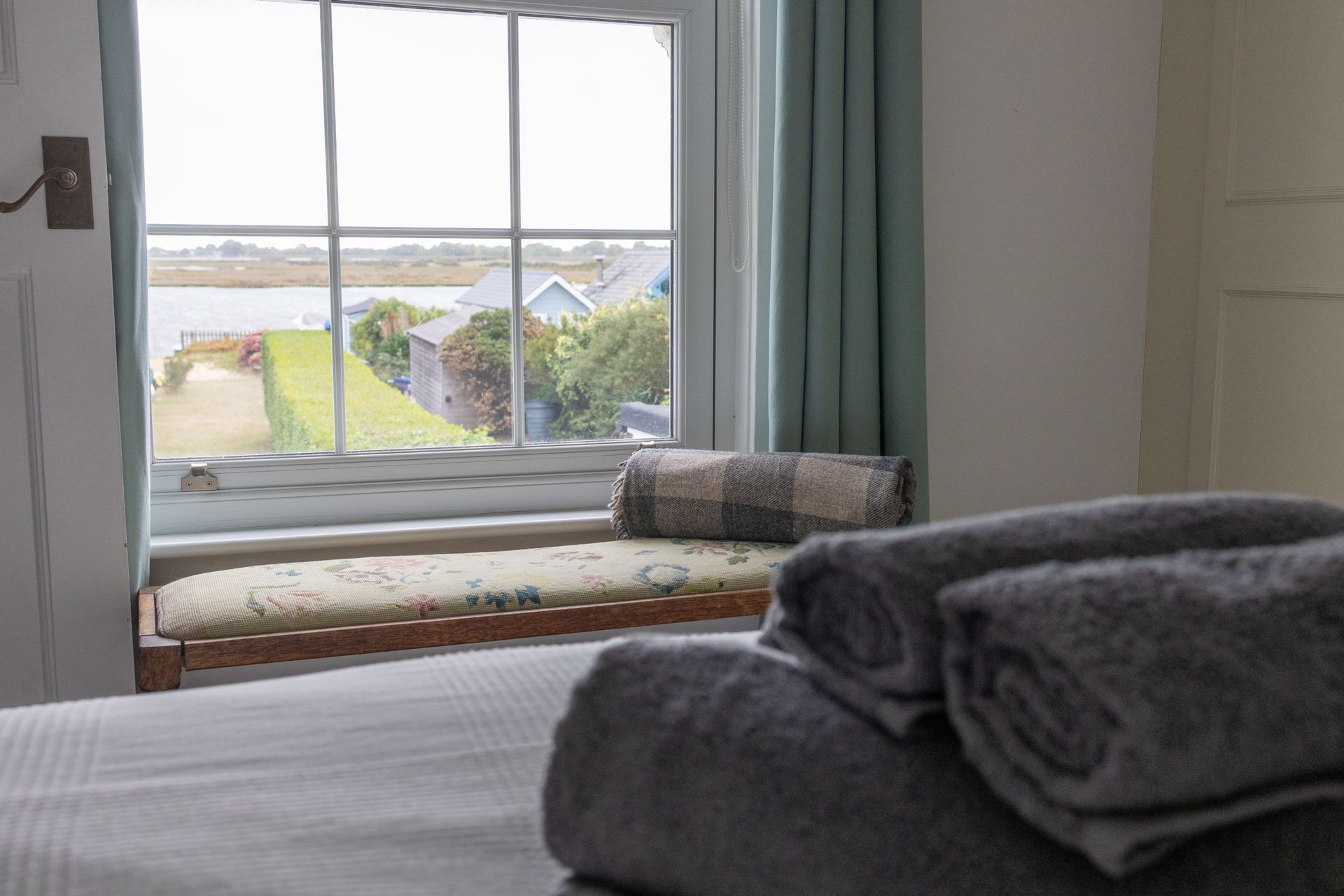Upstairs are three well apportioned bedrooms; the master bedroom has great views down the garden towards the water and so does the twin room. Both ‘doubles’ have king size beds and there is a family bathroom with bath and shower above.