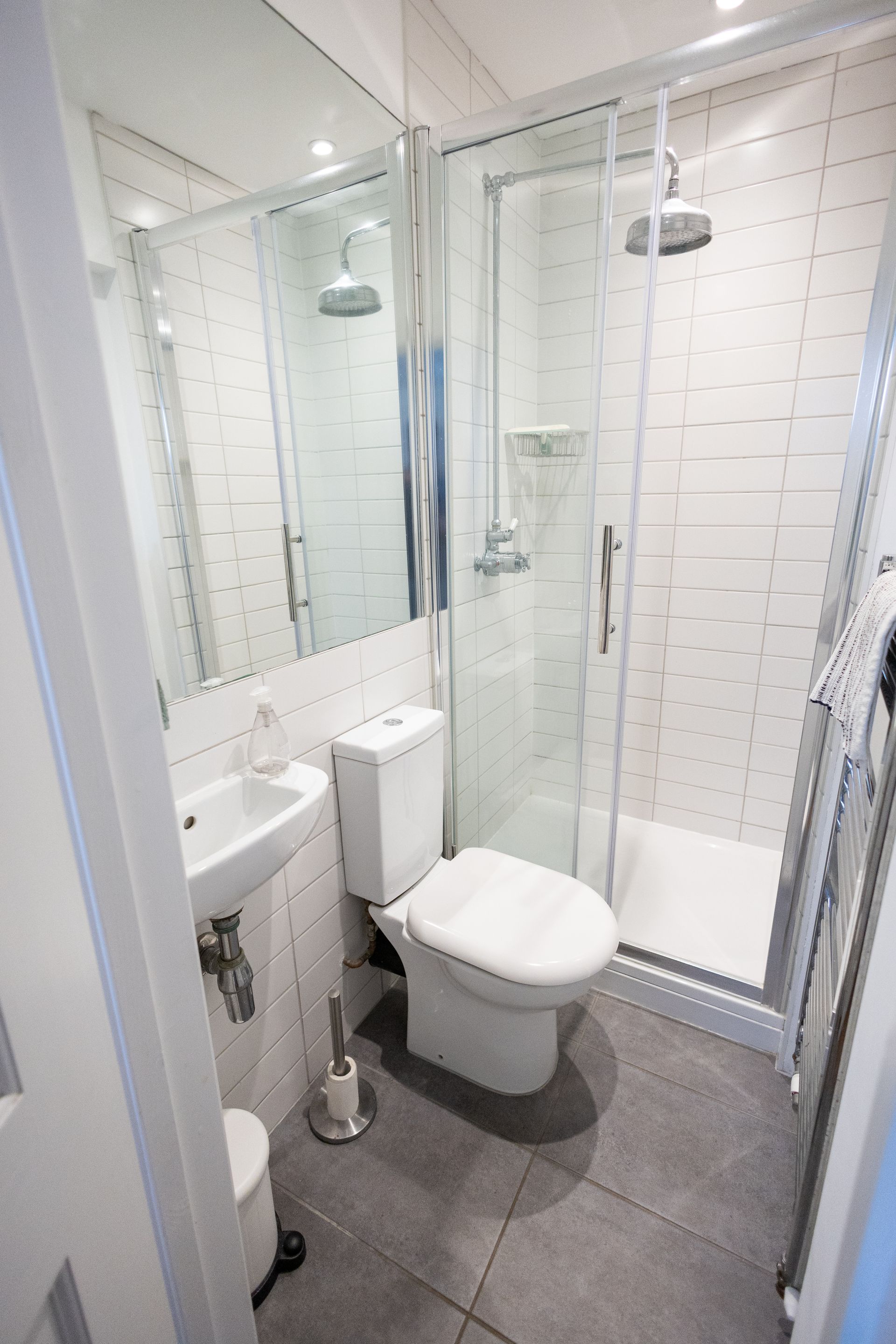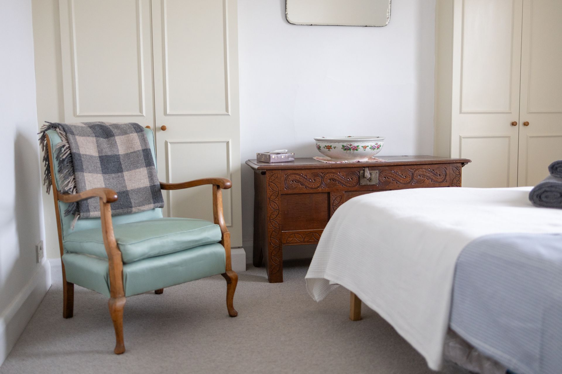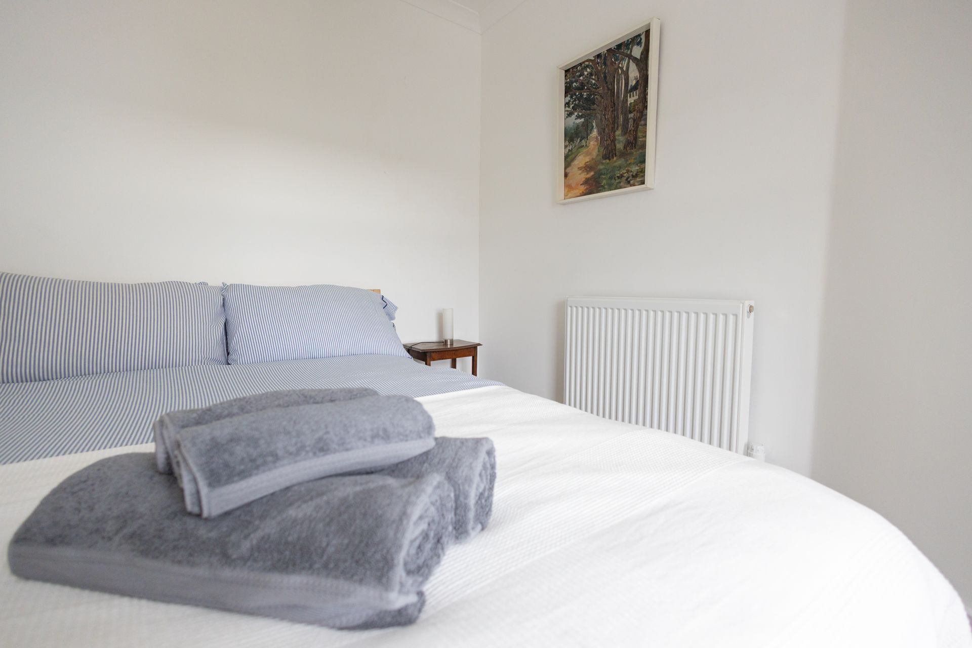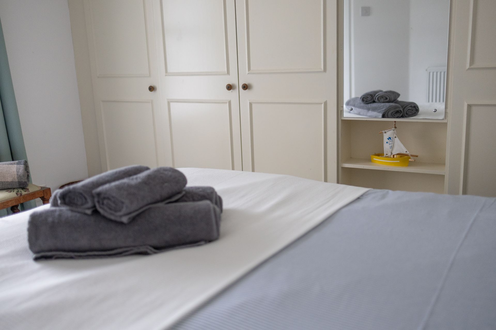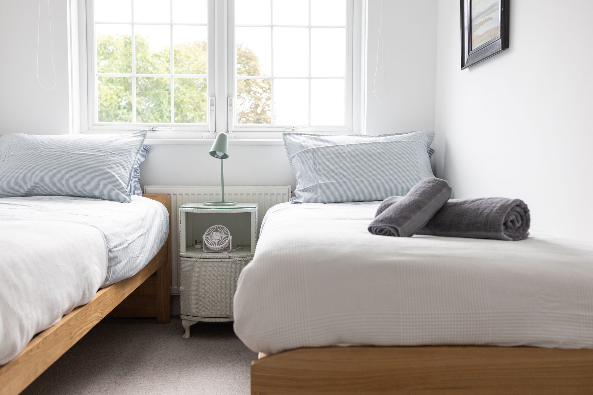 Upstairs are three well apportioned bedrooms; the master bedroom has great views down the garden towards the water and so does the twin room. Both ‘doubles’ have king size beds and there is a family bathroom with bath and shower above.