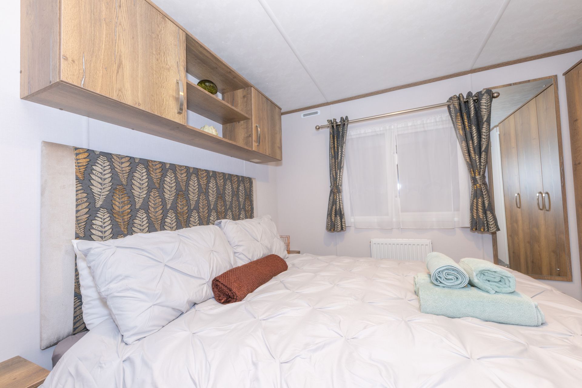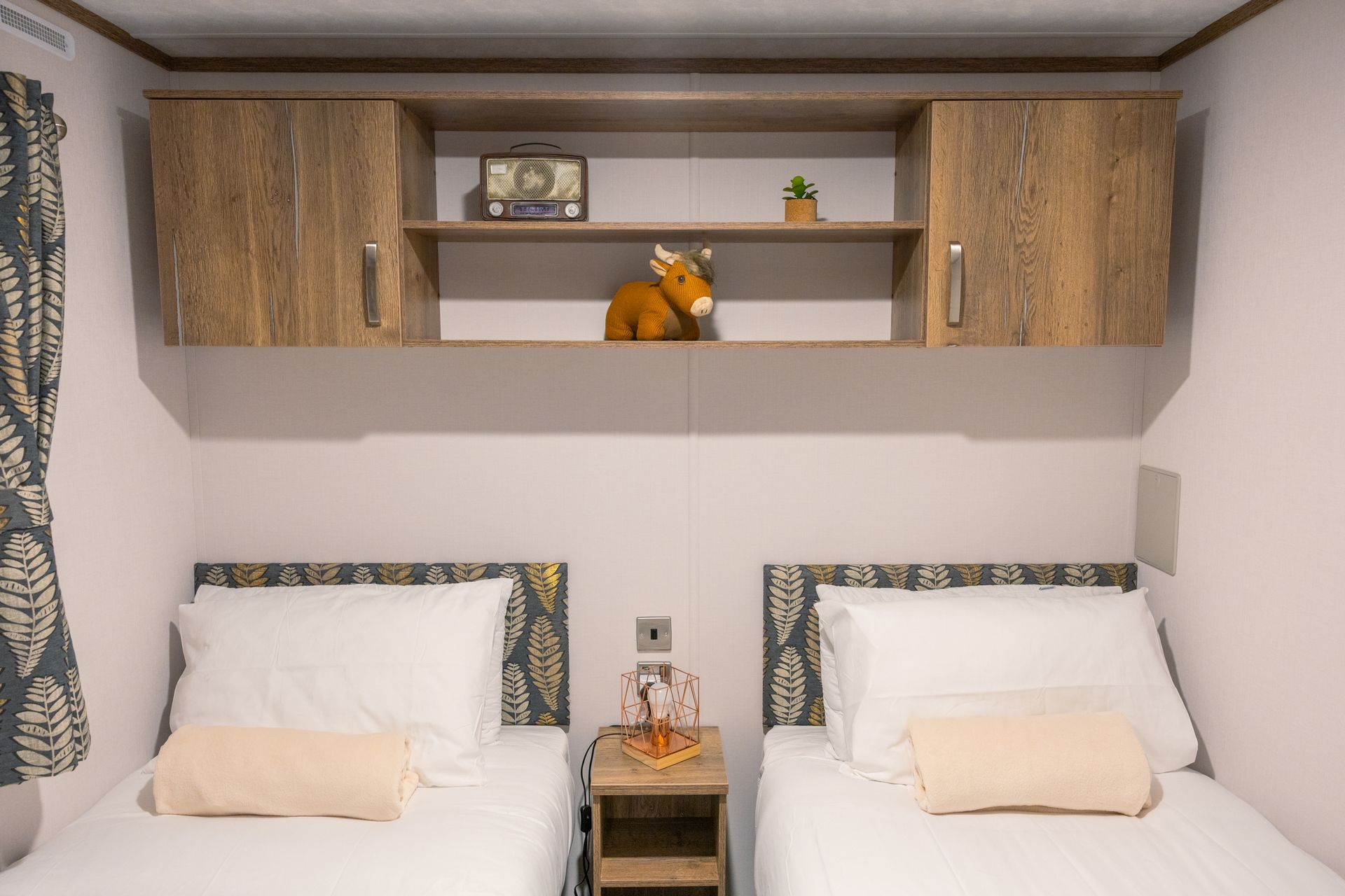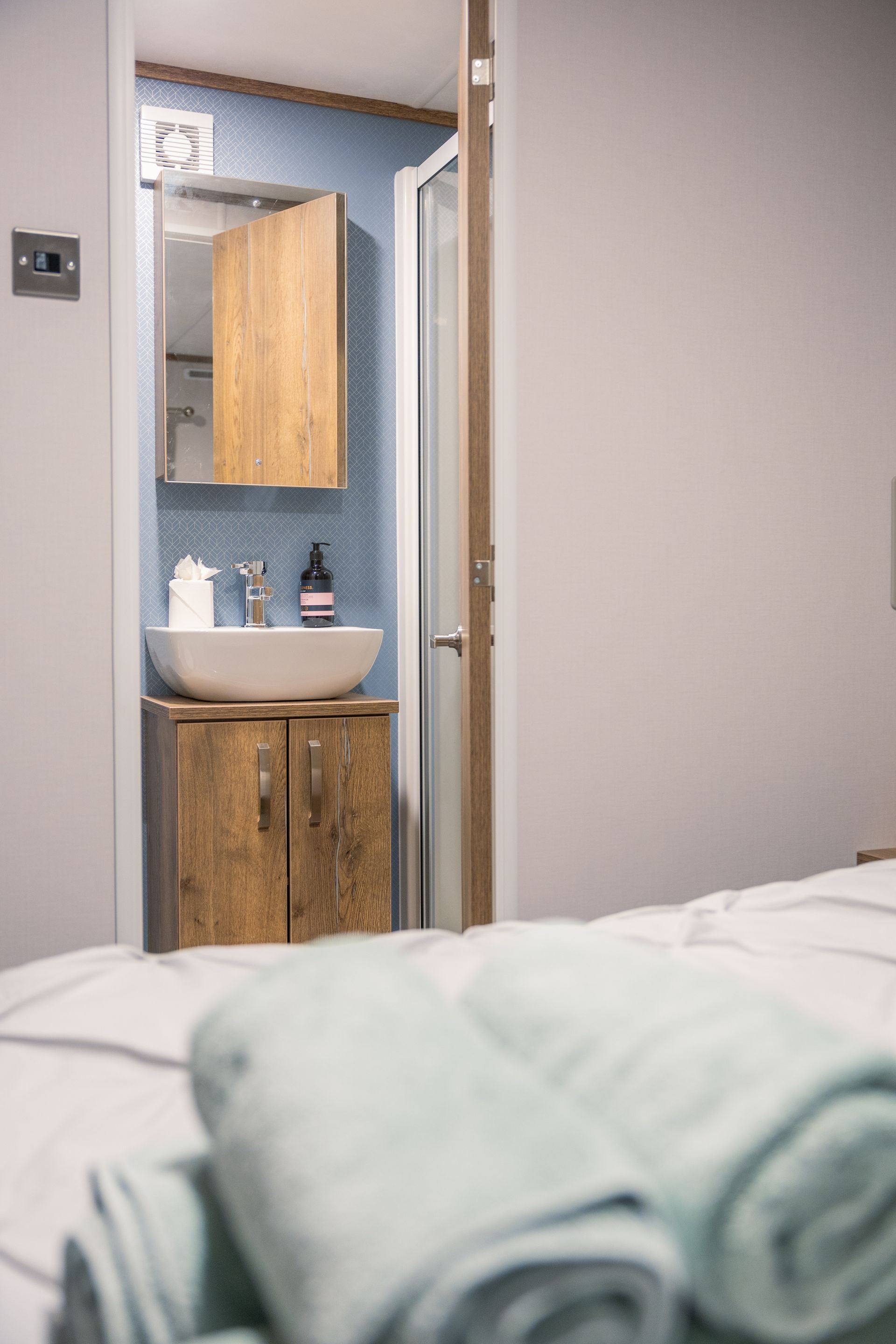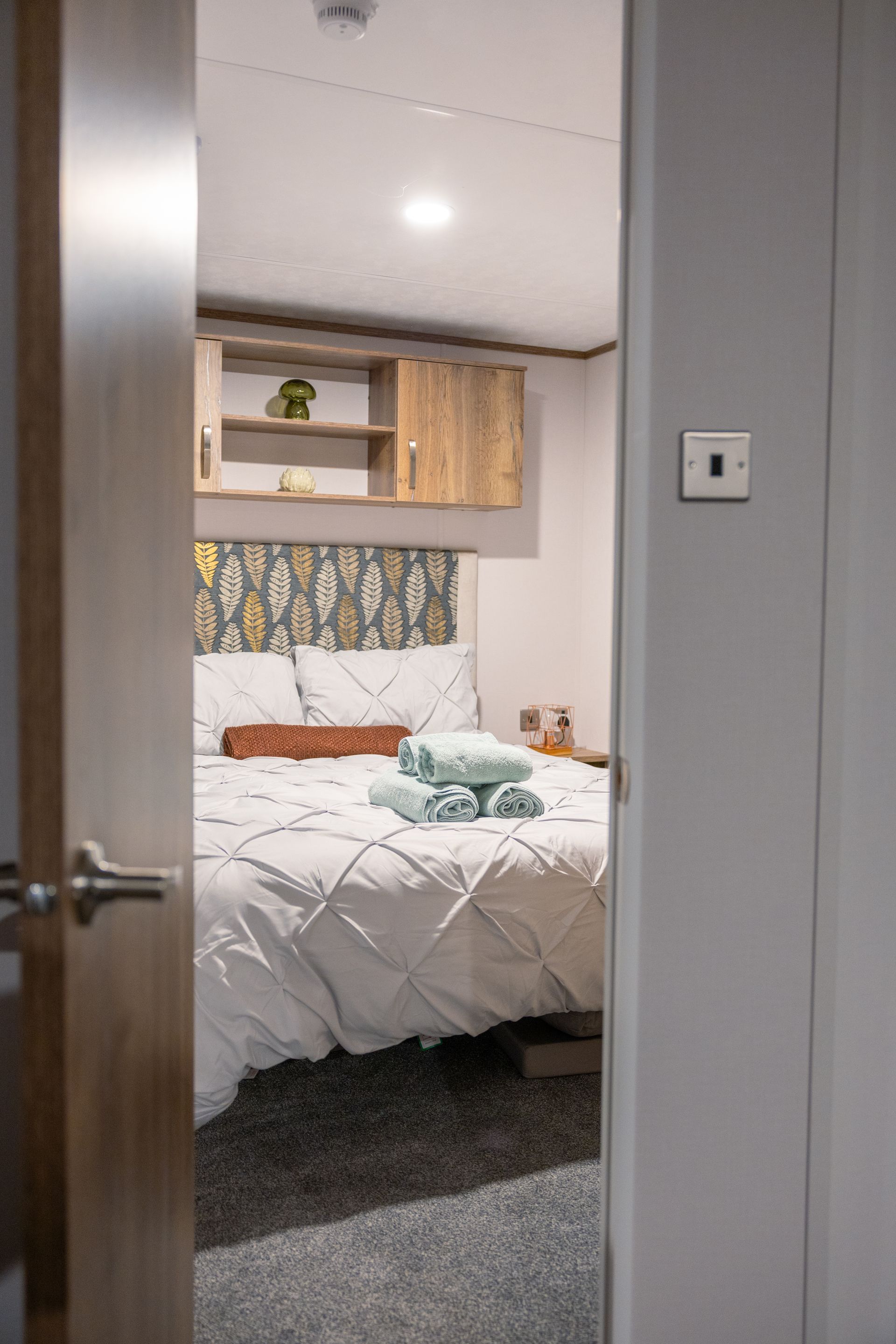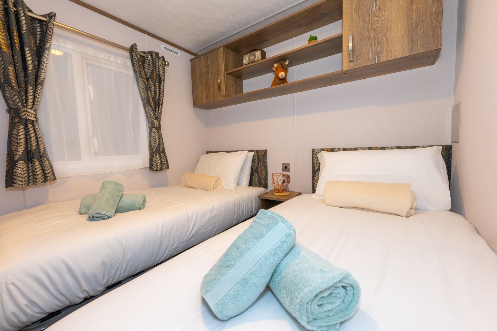 The King master bedroom features generous storage, a Smart TV and a private en-suite shower room. The twin bedroom offers two full-size single beds and is conveniently located next to the family shower room.