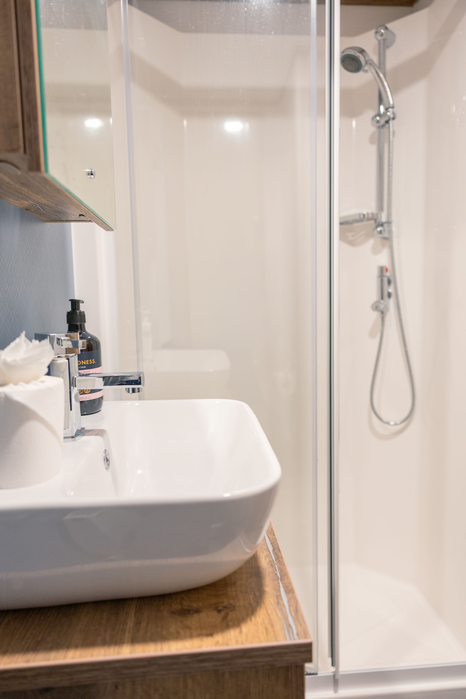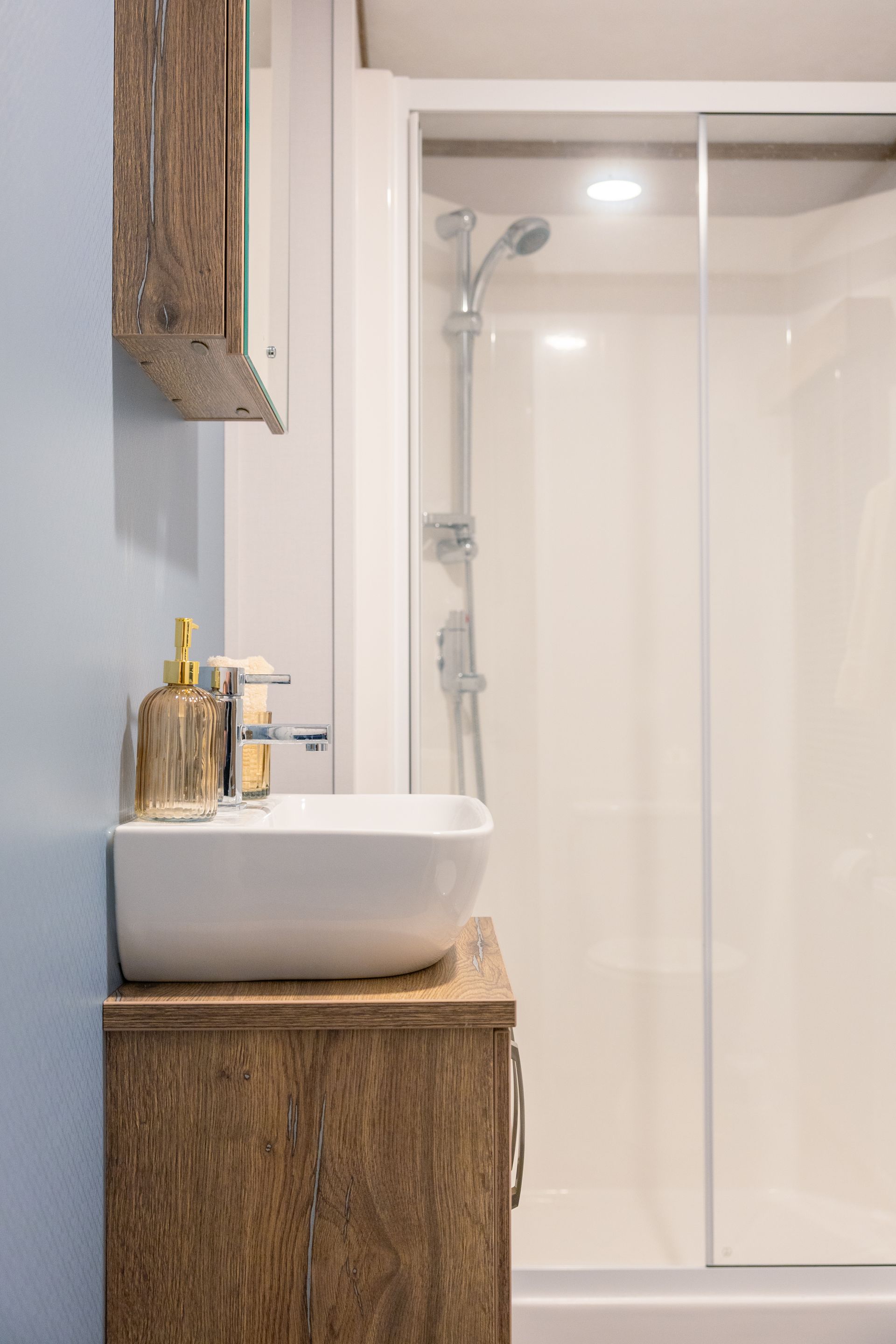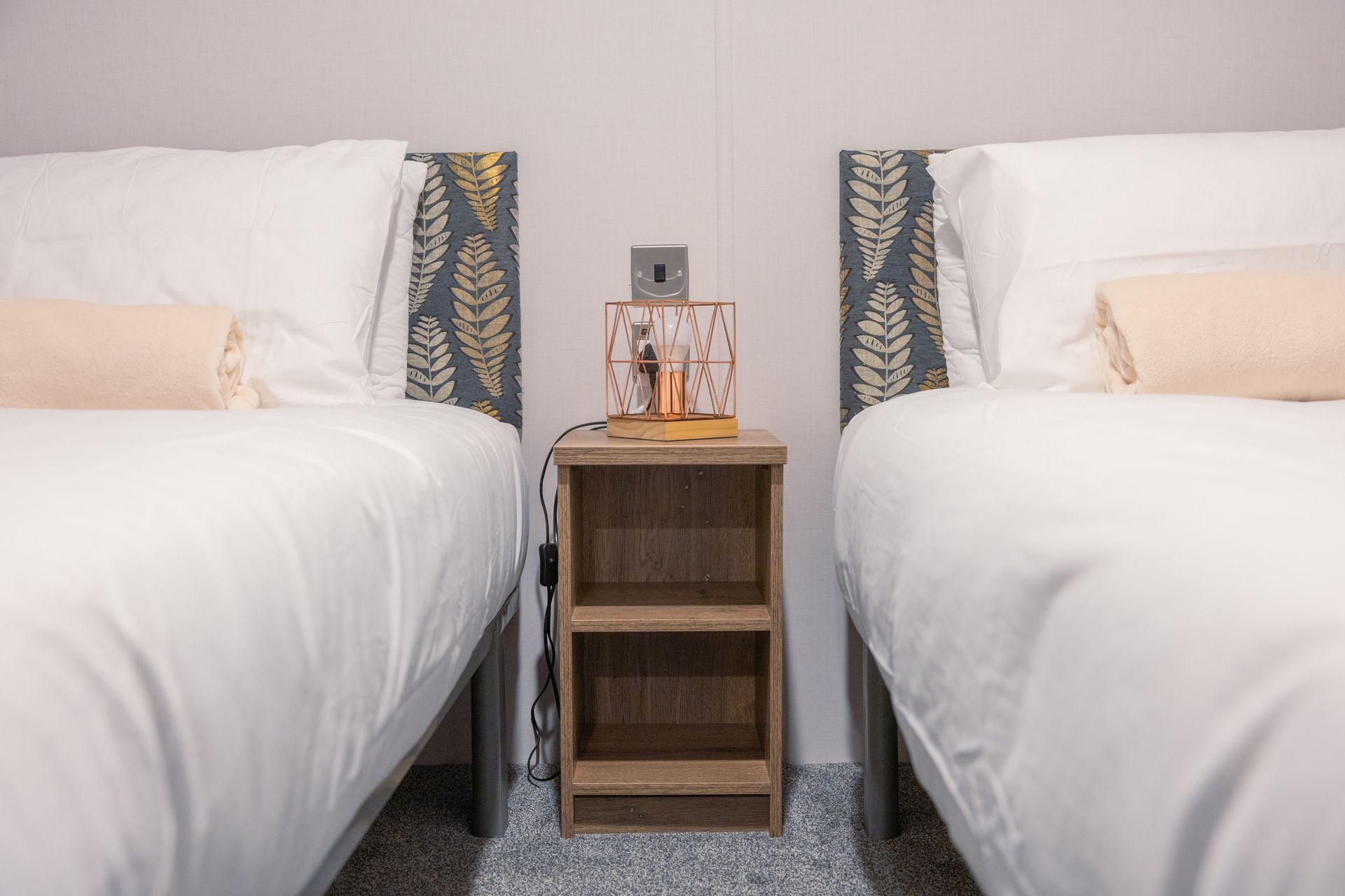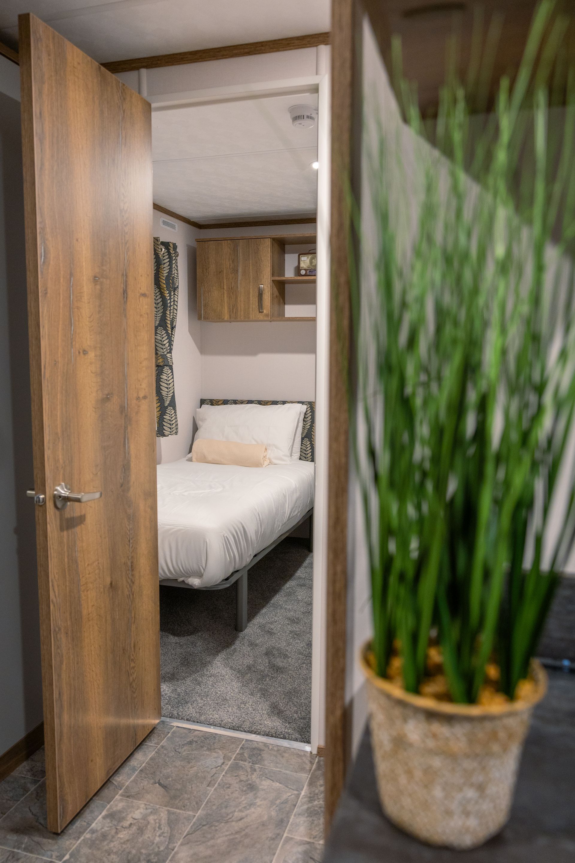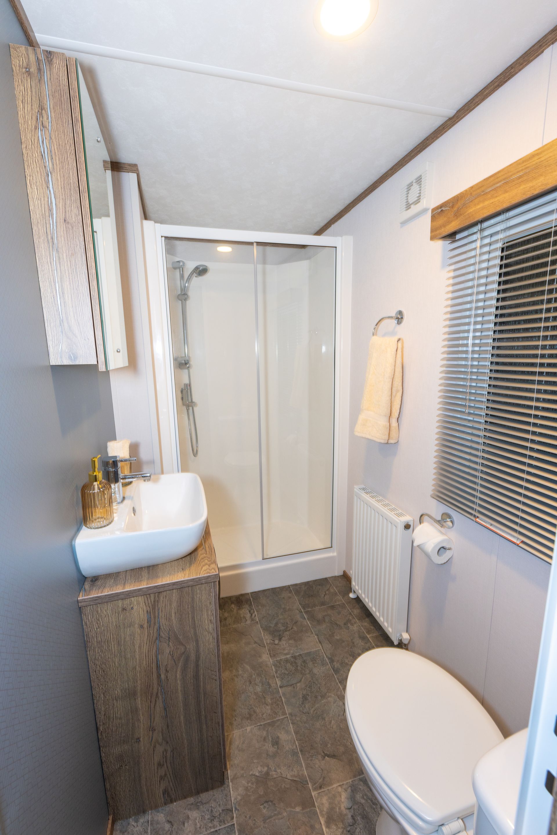 The King master bedroom features generous storage, a Smart TV and a private en-suite shower room. The twin bedroom offers two full-size single beds and is conveniently located next to the family shower room.