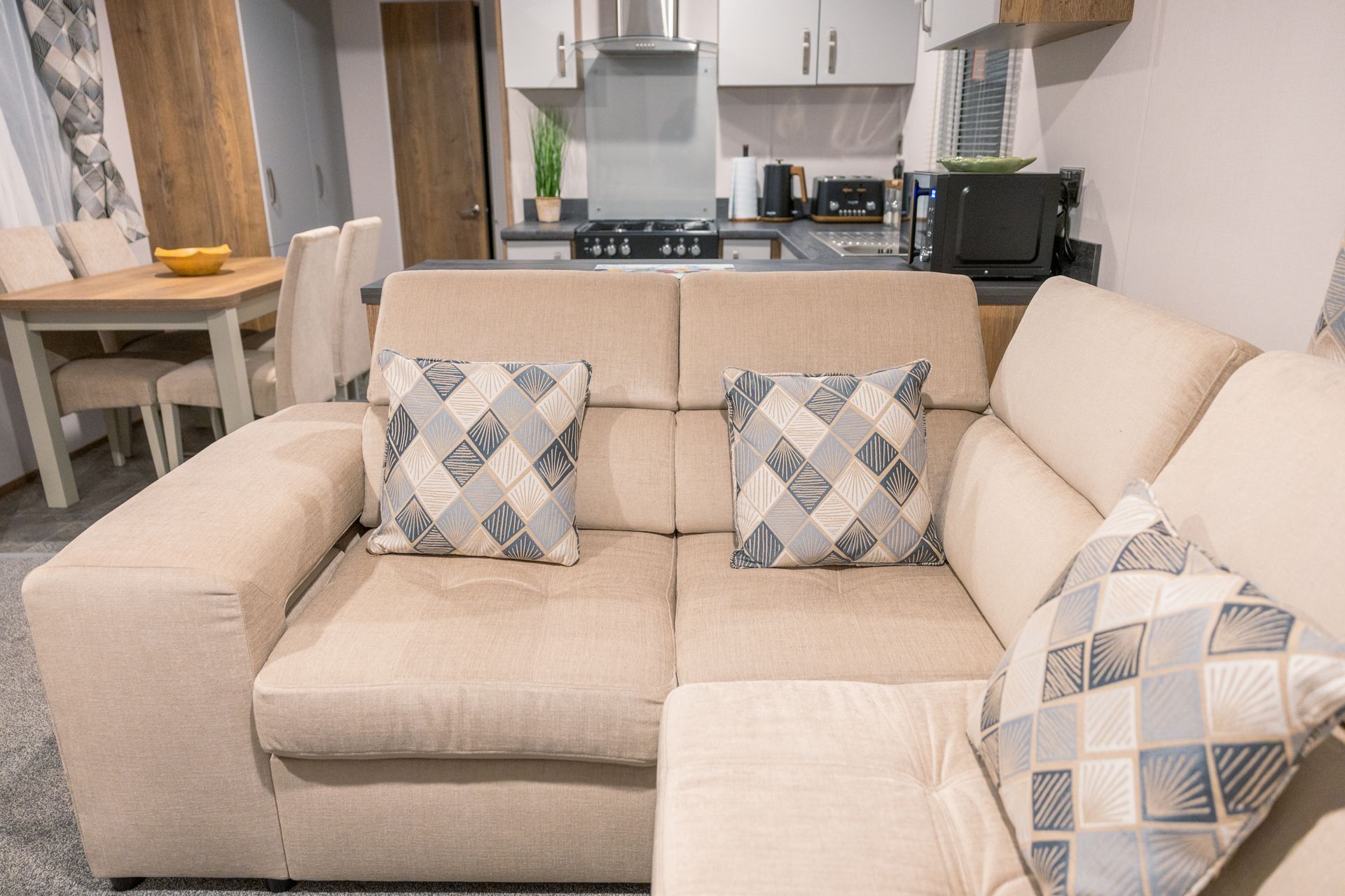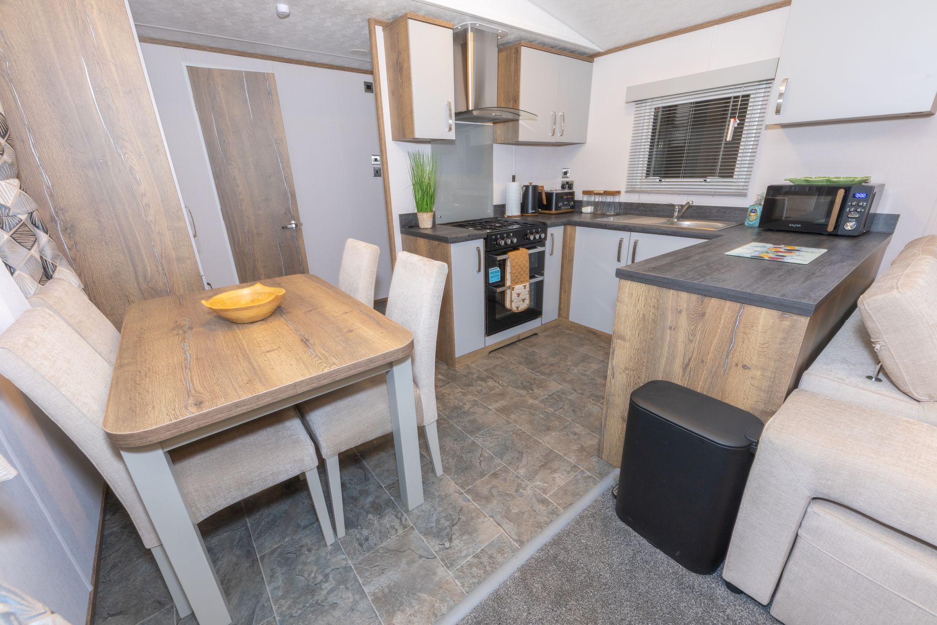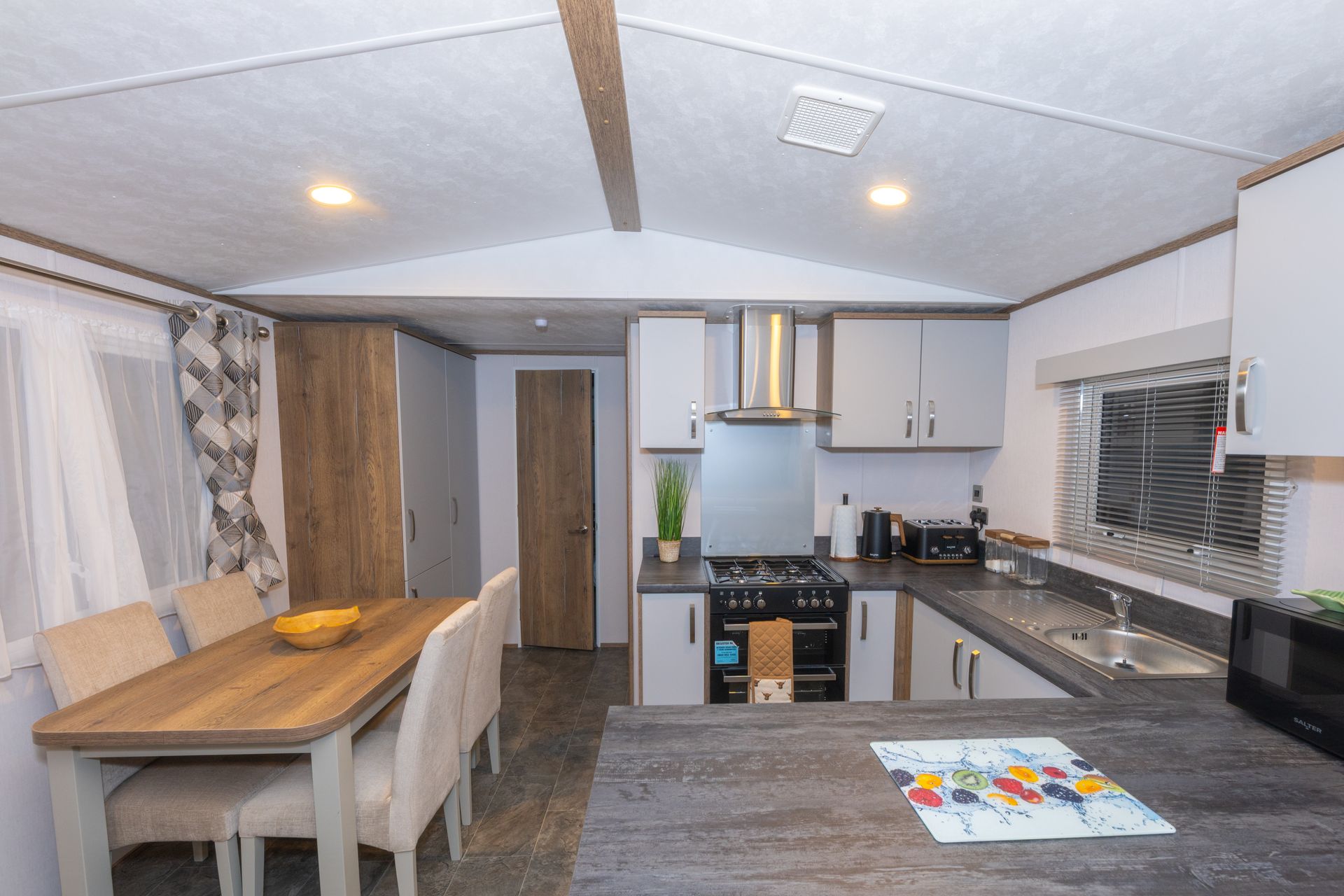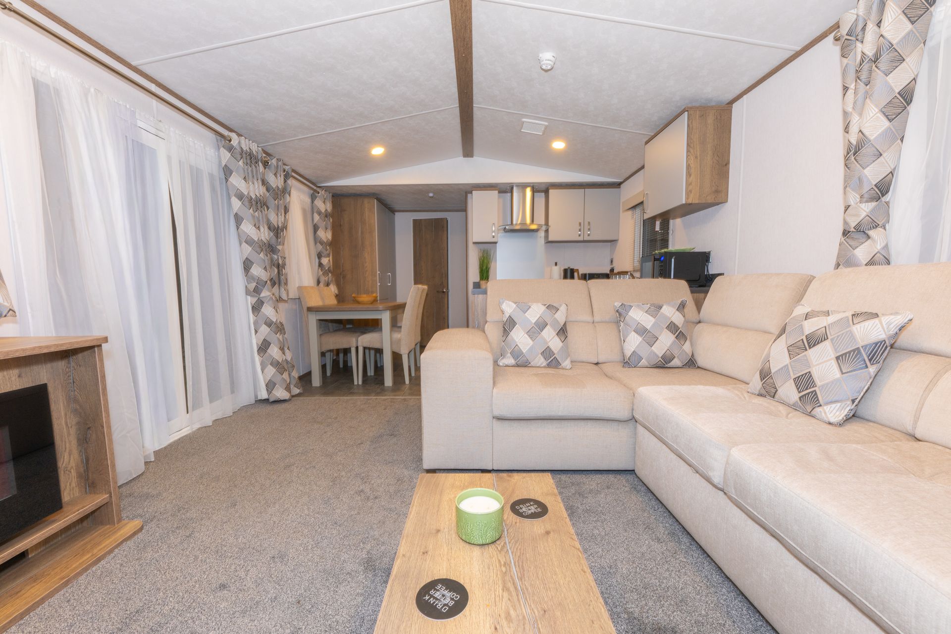 The spacious open-plan living area is designed for comfort and sociability. Sink into the plush L-shaped sofa, enjoy cosy evenings by the flame-effect electric fire, or relax with a movie on the Smart TV. Patio doors open directly onto the decking, creating a seamless indoor-outdoor living space; perfect for morning coffee, alfresco dining or a chilled drink at sunset.