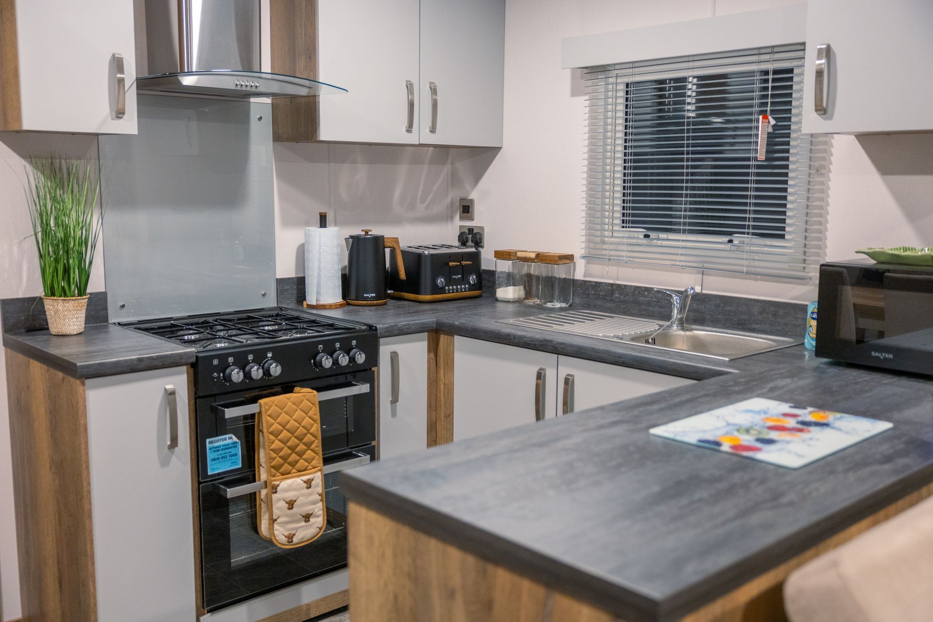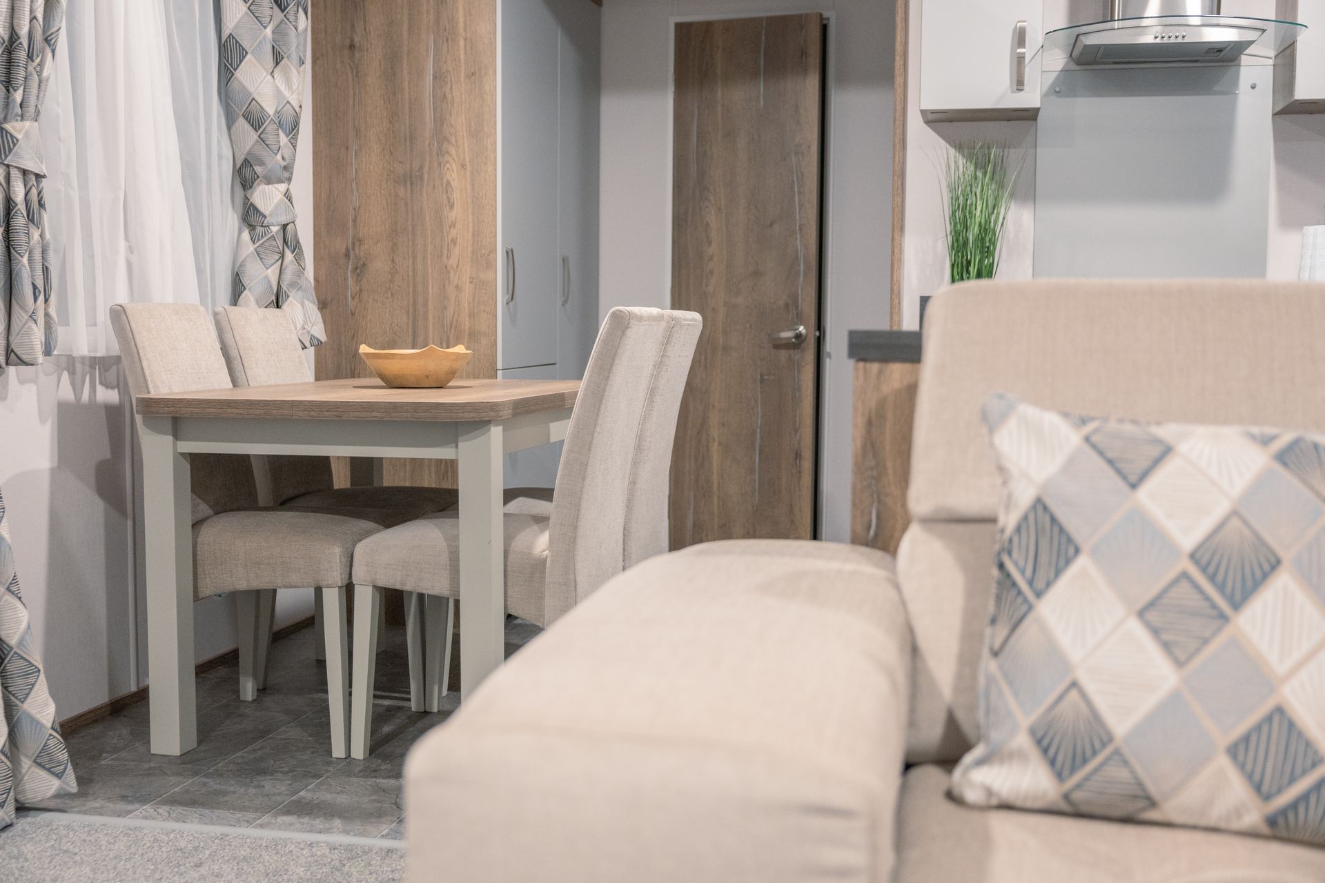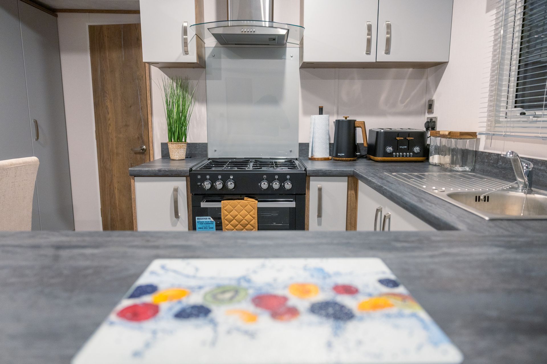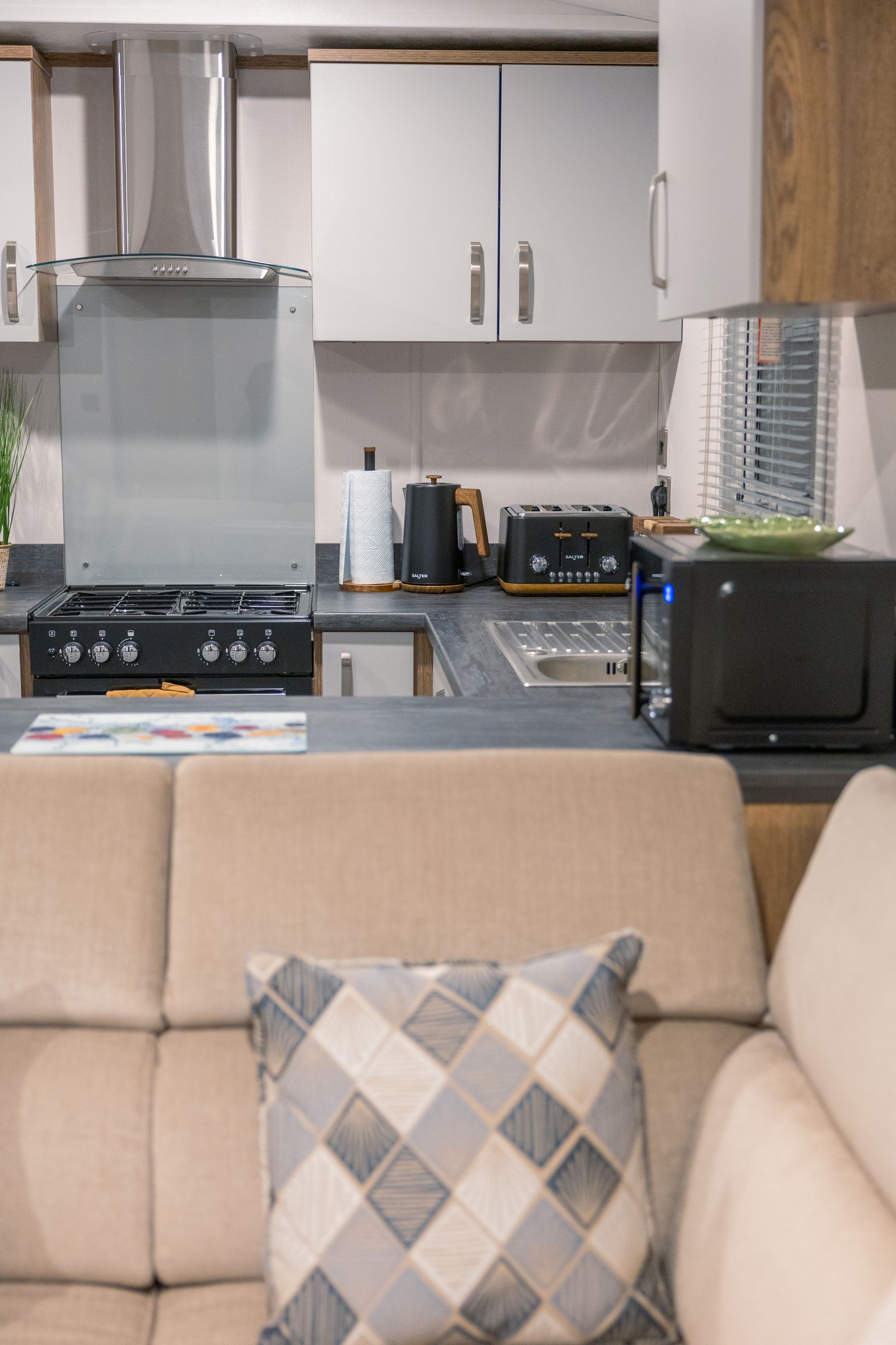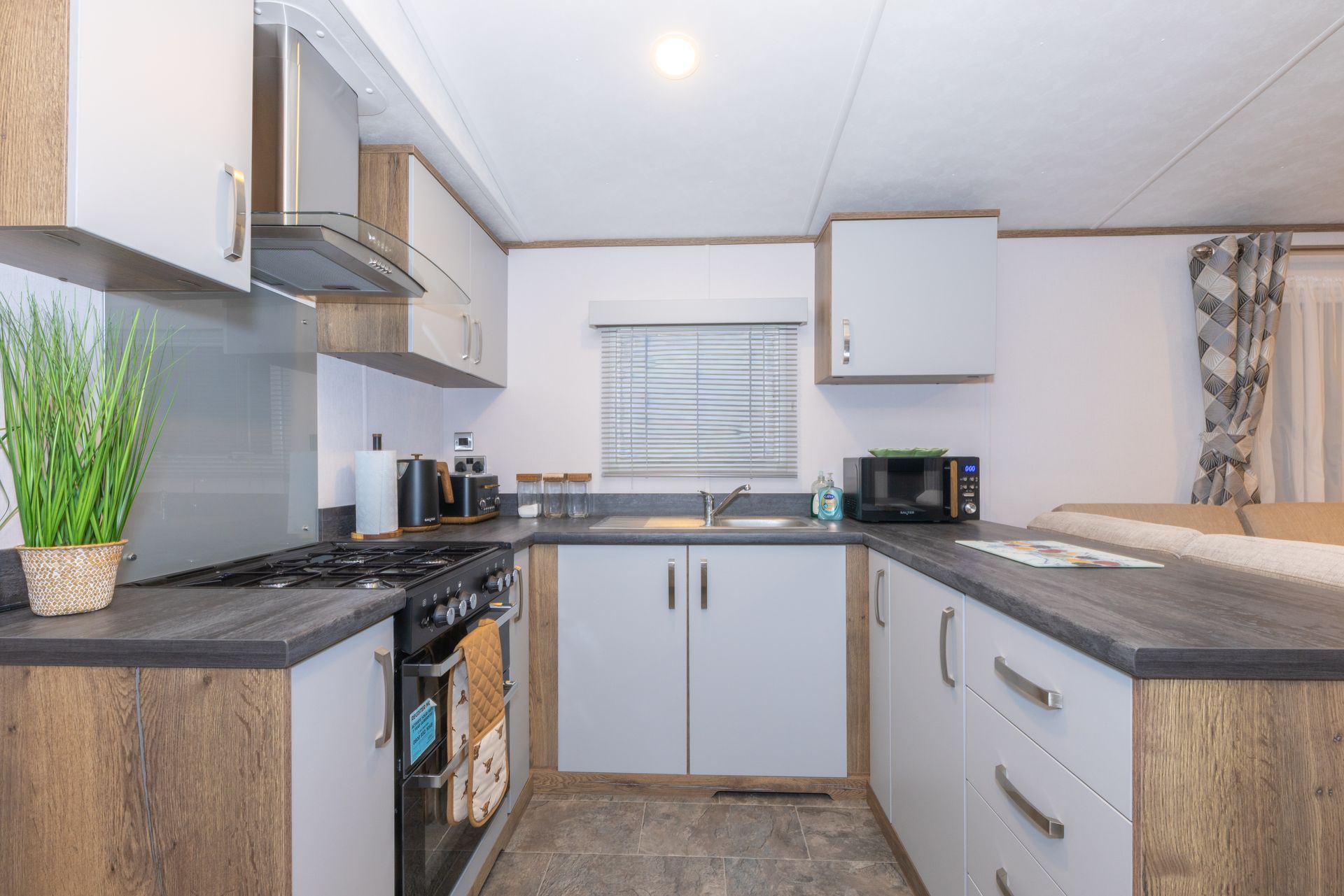 The spacious open-plan living area is designed for comfort and sociability. Sink into the plush L-shaped sofa, enjoy cosy evenings by the flame-effect electric fire, or relax with a movie on the Smart TV. Patio doors open directly onto the decking, creating a seamless indoor-outdoor living space; perfect for morning coffee, alfresco dining or a chilled drink at sunset.