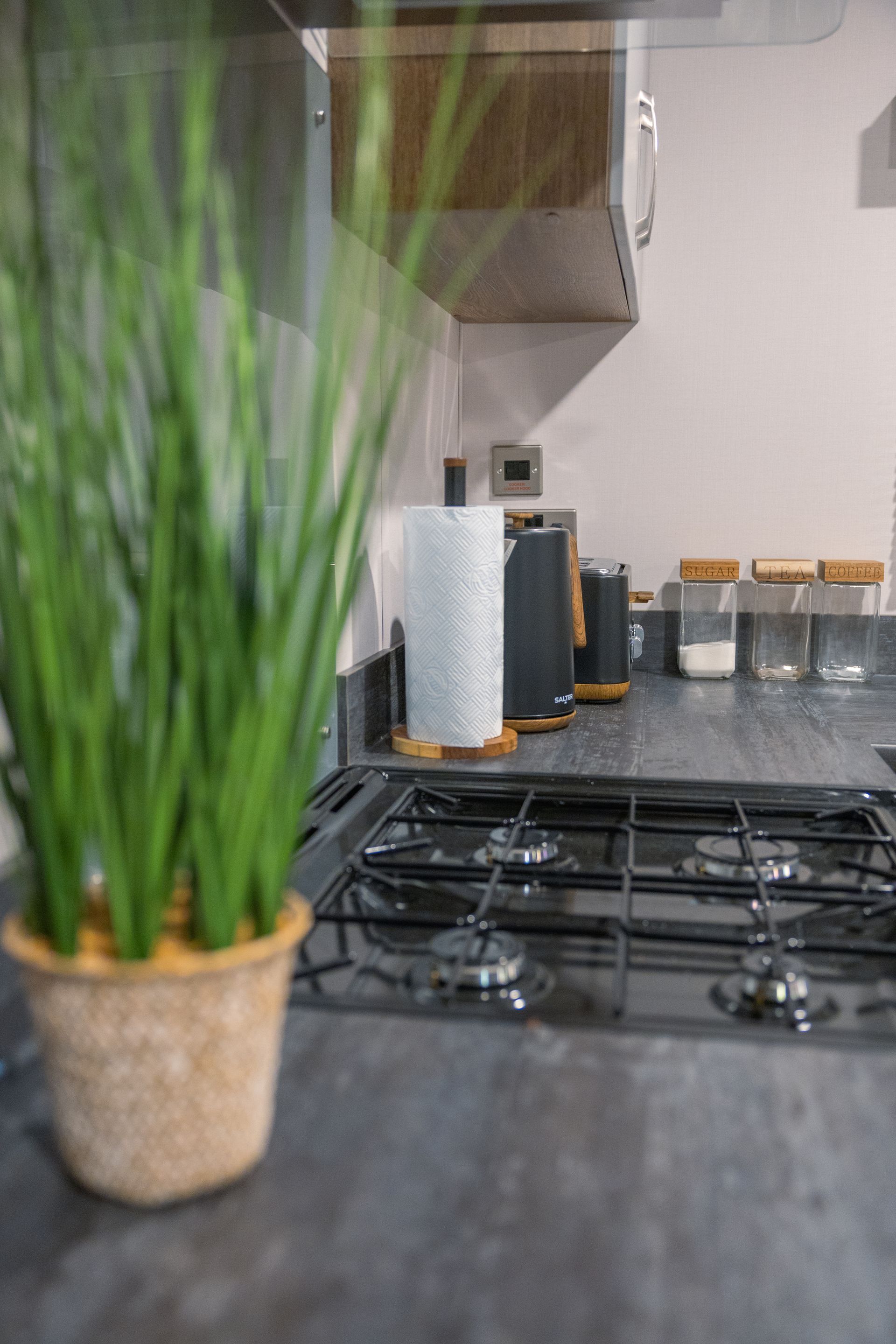 The modern kitchen is thoughtfully equipped for self-catering holidays and includes: cooker, microwave, air fryer, slimline dishwasher, fridge/freezer, washing machine, ample crockery, utensils and storage.